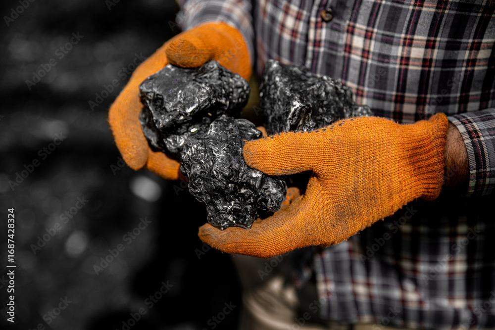 Hands of an elderly man in work gloves holding pieces of coal for traditional use for warmth, heating a home