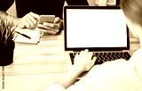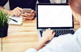 Women using a laptop on white screen. Take your screen to put on advertising.