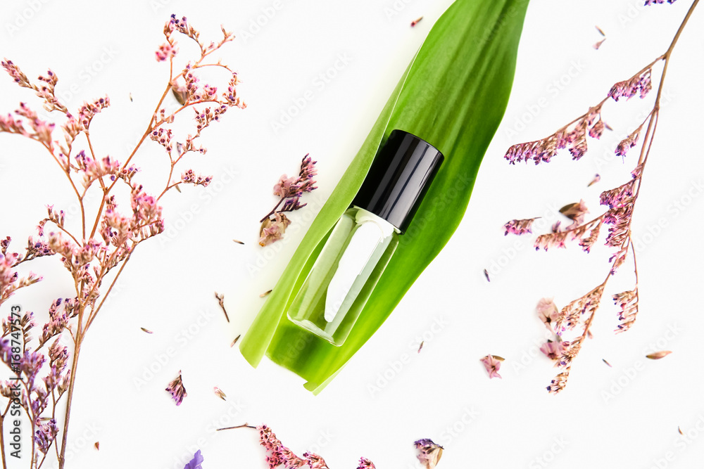 White cream bottle placed, Blank label package for mock up on a green foliage background and flowers. The concept of natural beauty products.