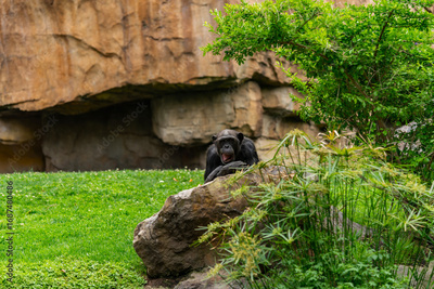 A chimpanzee leans on a large rock, yawning or calling out, surrounded by greenery and rocky landscape.