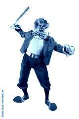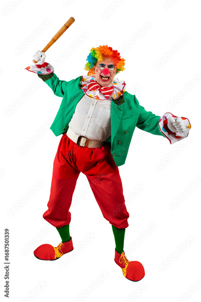 Bad, angry clown club-swinging. Horrible Halloween Joker in colorful suit and wig. Buffoon with clown whiteface makeup. Trickster, jester