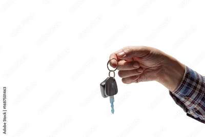 Concept of selling or renting a car. Hand of man in a checkered shirt holding car keys on isolated background