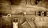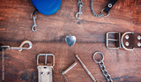 Pet accessories on wooden background. Top view. Pets and animals concept