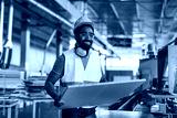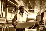 Smiling Construction Worker Holding Materials in a Modern Industrial Workshop