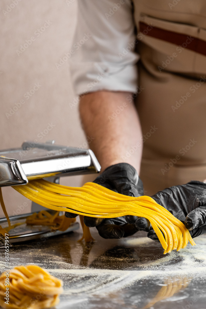 Chef making fresh egg pasta with manual machine, wearing black gloves and apron. Yellow noodles being cut and floured on work surface in professional kitchen