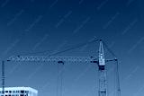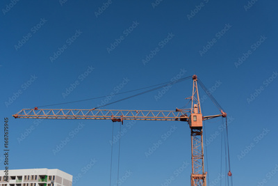 Construction crane operates under clear blue sky at a building site near urban area