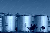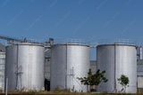 Grain storage silos and warehouse hangars situated under a clear blue sky at an agricultural facility