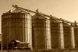 Grain storage silos and railroad car near large warehouse hangars at agricultural facility