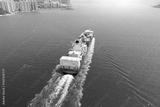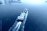 Big heavy container ship leaves the bay and strait for the open ocean near a metropolis with multi-story buildings