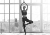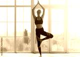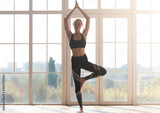 Young sporty woman doing yoga, practicing tree pose over big panoramic window, morning exercising, copy space