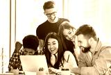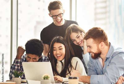 We did it. Euphoric students watching exam results on laptop, sitting together in college library