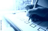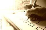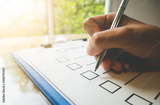 Close- up hand holding pen on check list paper and the format for filling in information in business concept,vintage style and softtone.