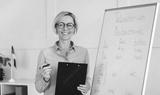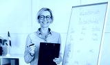 Online schooling concept. Portrait of positive German teacher posing near blackboard with grammar rules, looking at camera and smiling, indoors. Foreign languages tutor giving remote lesson