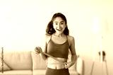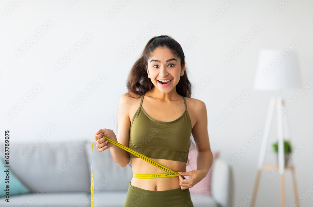 Portrait of young Indian woman measuring her waist with tape indoors, smiling at camera. Beautiful slim Asian lady having fit body with perfect parameters. Healthy diet and weight loss concept