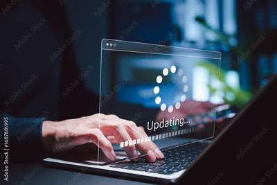 Software Update and System Upgrade Concept. Person holding phone while using laptop with software update progress interface and security, technology maintenance, application upgrades, system security.