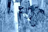 Paintball sport player in protective uniform and mask playing and shooting with gun outdoors.