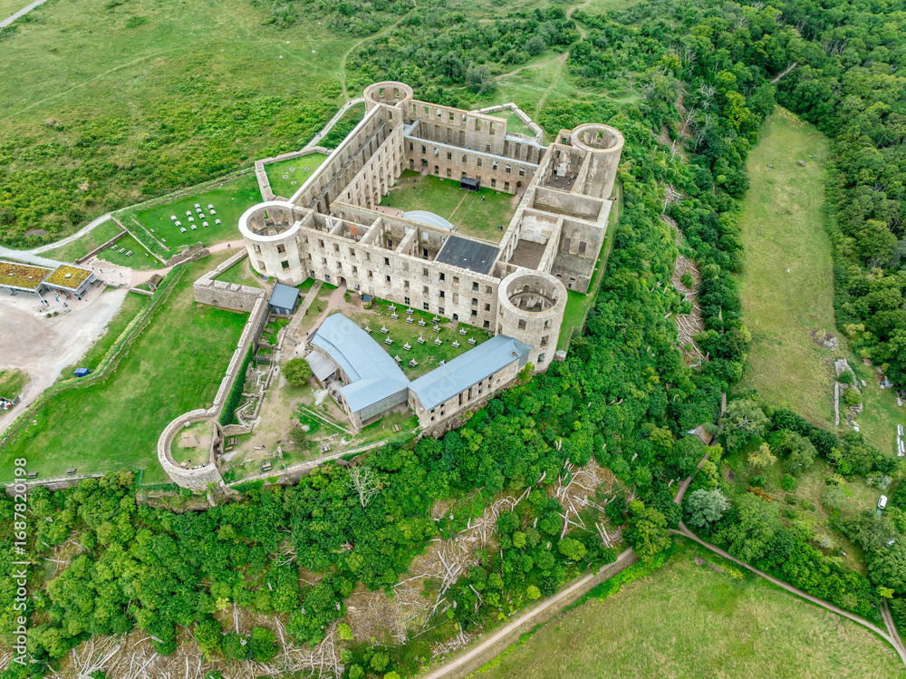 Aerial view of ruined Borgholm castle with round towers, star fort bastions on the the island of Öland in Sweden