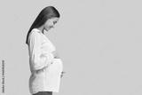 Pregnancy Concept. Young Pregnant Woman Touching Belly Dreaming About Baby Standing On White Studio Background. Side View, Empty Space