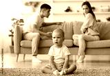 Domestic Quarrels Concept. Cute little infant baby boy sitting alone on floor separately from arguing parents at home, young family suffering relationship crisis, thinking divorse, selective focus