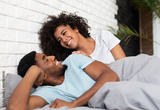 Wake up, darling. Happy young african-american couple waking up in bed in morning, smiling to each other, copy space