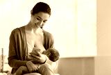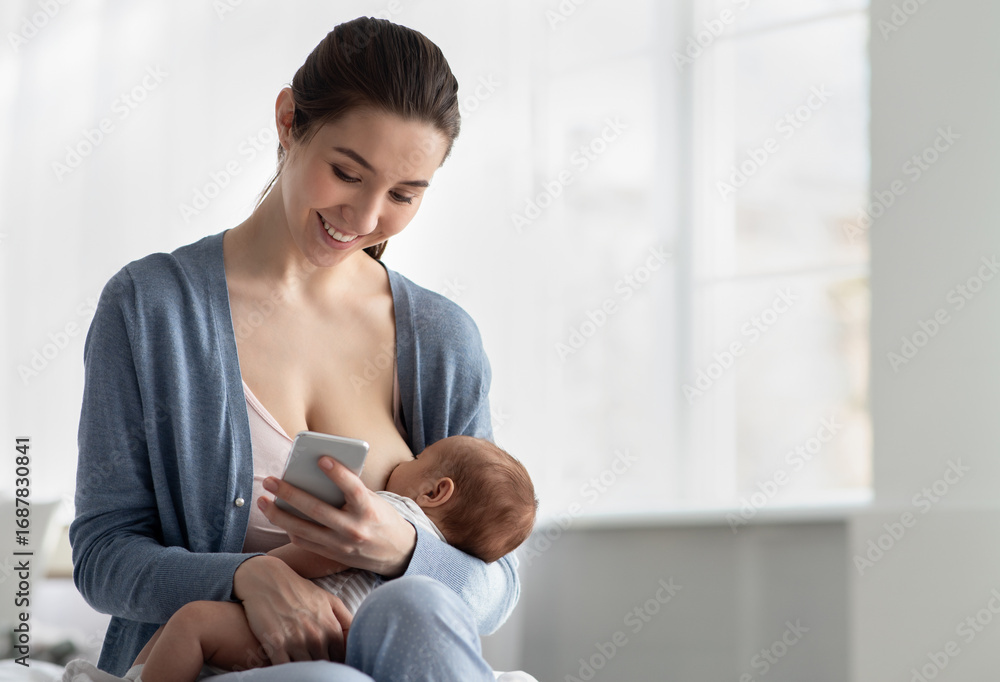 Happy Young Mother Using Smartphone While Breastfeeding Her Newborn Baby, Smiling Millennial Woman Messaging On Cellphone, Browsing New App Or Shopping Online While Lactating Infant Child At Home