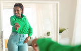 Self confident black woman pointing finger at her reflection in mirror, dancing and felling good, enjoying good mood. Independent lady with high self esteem talks positive and I can do it motivation.