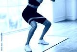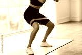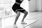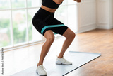 Closeup cropped view of athletic sportswoman squatting with elastic resistance band in fitness studio or at home in living room. Lady enjoying leg and buttocks work out with equipment