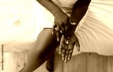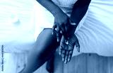 Top view of young black lady applying hand cream, sitting on bed after bath, wearing towel, pampering herself at home. Overhead shot of Afro woman making skin-care treatment
