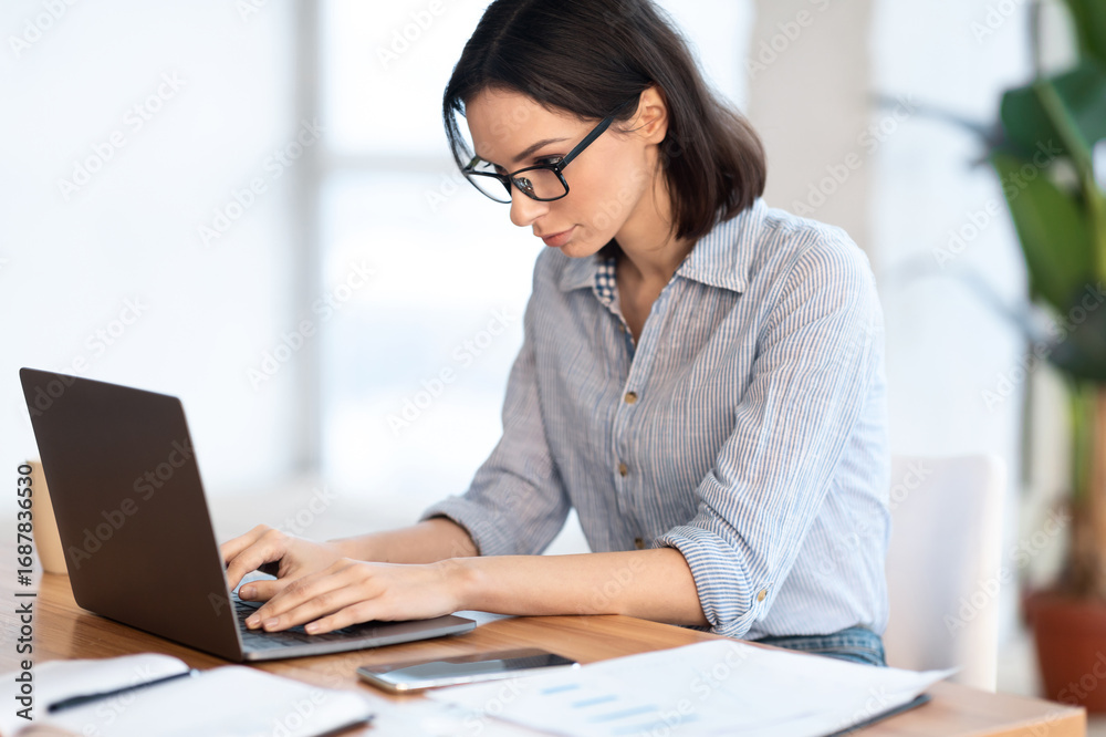 Home Office. Portrait of young woman in eyewear using laptop, working remotely, free space