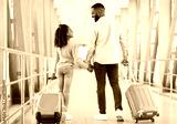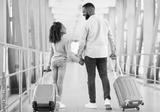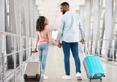 Ready For Travel. Rear back view of happy black father and daughter walking in modern airport corridor, carrying suitcases at terminal. Smiling parent holding hands with daughter looking at each other