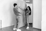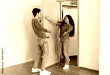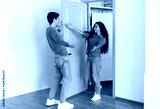 Welcome. Portrait of excited lady greeting guy meeting him at front door, wants to hug, inviting guest to enter her flat, welcoming home, happy couple standing in doorway of new modern apartment