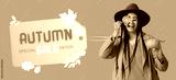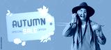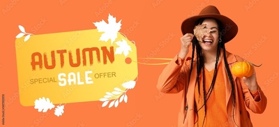 Happy African-American woman with pumpkin, leaf and text AUTUMN SALE on orange background