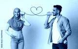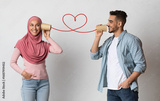 Romantic arab guy sending love message to muslim girlfriend through paper cup phone connected by heart shaped string, standing together over grey studio background, collage for Valentine's day