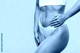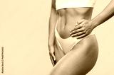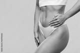 Body Shaping. Unrecognizable young woman in white underwear demonstrating her perfect sporty figure while posing over beige studio background, cropped shot of fit female in lingerie, copy space