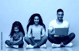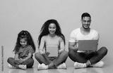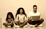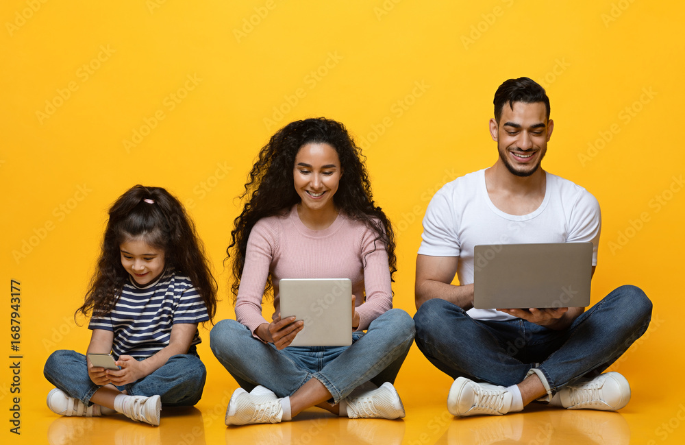 Family Gadgets. Portrait Of Young Middle Eastern Family Of Three Using Different Electronic Devices, Happy Arab Parents And Little Daughter Spending Time With Laptop, Digital Tablet And Smartphone