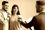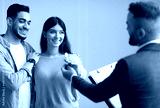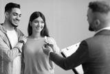 Happy smiling Middle Eastern couple taking key of future new apartment. Professional real estate agent wearing suit holding in hand and giving keys to young buyers. Mortgage, Property For Sale Concept