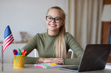 Cute teen girl with USA flag using laptop, studying american english online from home, copy space. Smiling female teenager having educational online course, foreign languages learning
