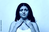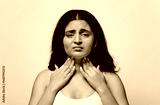 Portrait of unhappy sad sick indian woman suffering from sore throat, ill young eastern lady touching neck with hands, feeling ache, standing isolated over beige studio background, copy space