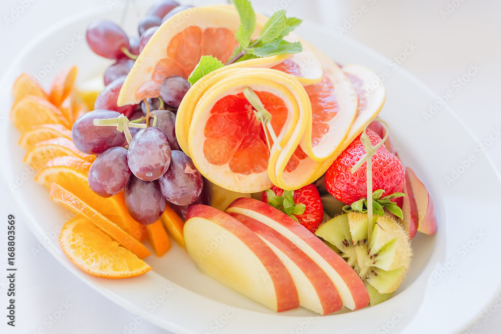 White fruits plate with strawberry, grape-fruit, grapes, orange, herbs and cheese. Close up image with selective focus.