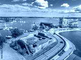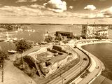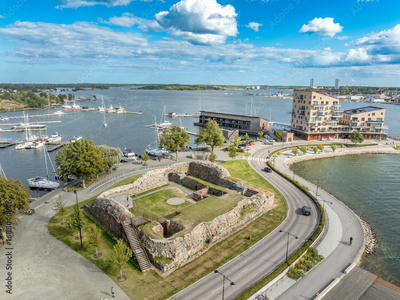 Aerial view of Stegeholm castle in Vastervik Sweden. Small ruined square shape stronghold controlling the water ways