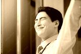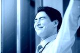 窓際でストレッチする休憩する爽やかなビジネスマン男性のクローズアップ