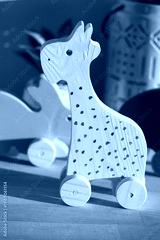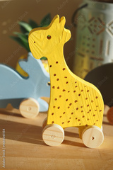 Wooden toy giraffe with colorful design and wheels