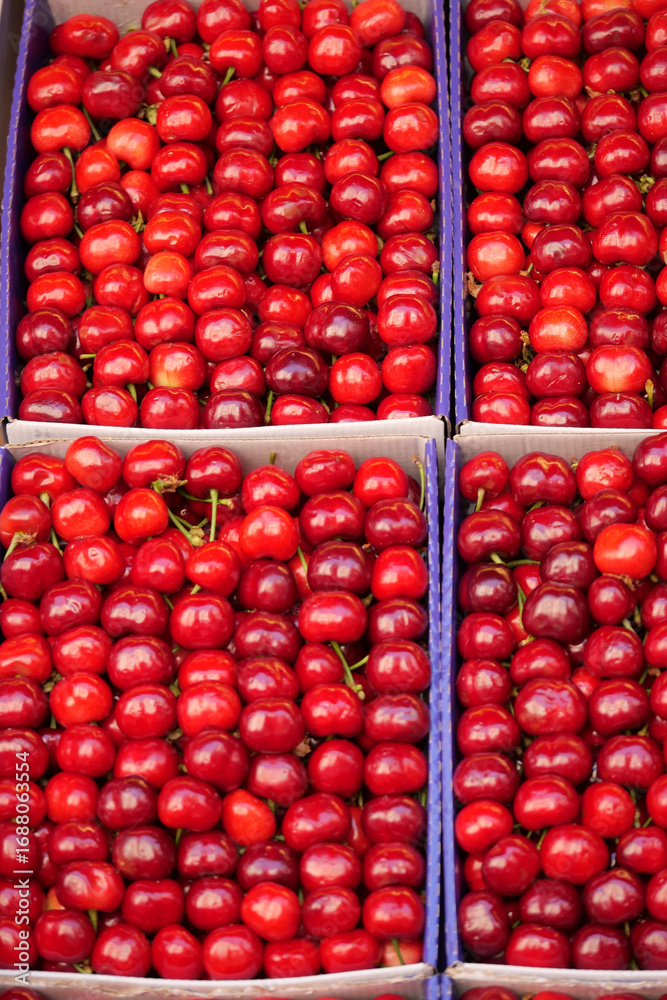 Fresh cherries displayed at a local market in summer