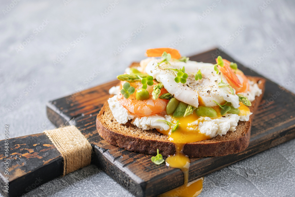 Homemade sandwiches with cheese cream, avocado, asparagus, shrimp and poached egg