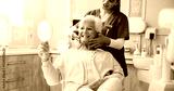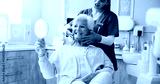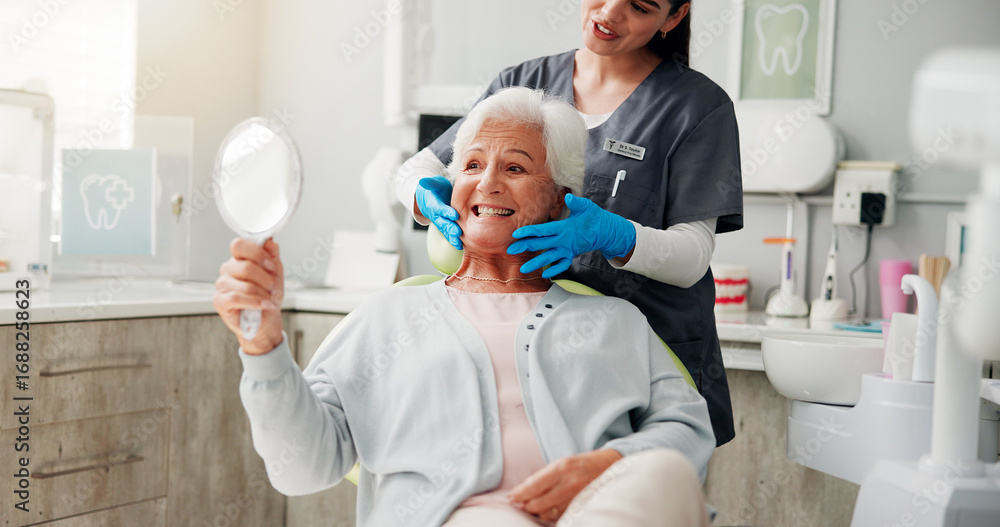 Dentist, senior woman and mirror with results for teeth whitening, dental implant or oral care. Retirement, healthcare and doctor with happy old patient in clinic for dentures or root canal treatment