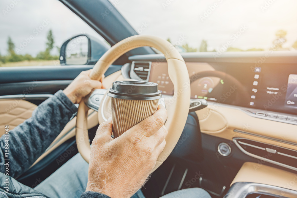Man hands holding steering wheel and cup of coffee in car, in the morning not sleeping be energetic while driving. Transportation and vehicle concept