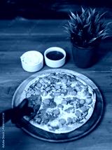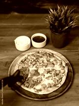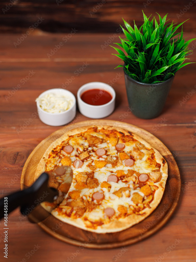 Tasty chicken and sausage crispy pizza on wooden plate using pizza cutter to slice delicious melting mozzarella cheese on board homemade cooking ingredient lying on dark background, food advertisement
