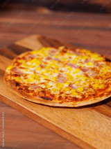 Tasty corn and bacon crispy pizza flatbread baked on baking steel plate, delicious melting mozzarella cheese on wooden table, homemade cooking ingredients lying on dark background, food advertisement.