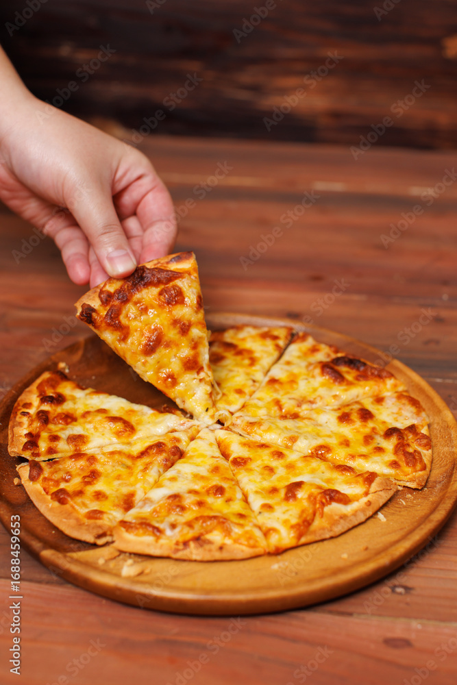 Hand lifts slice delicious melting tasty cheese crispy pizza with stretchy mozzarella cheese pull on wooden board homemade cooking ingredients lying on dark background, food advertisement top view.