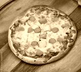 Tasty chicken and sausage crispy pizza flatbread baked on wooden plate, delicious melting mozzarella cheese on wooden board, homemade cooking ingredients lying on dark background, food advertisement.